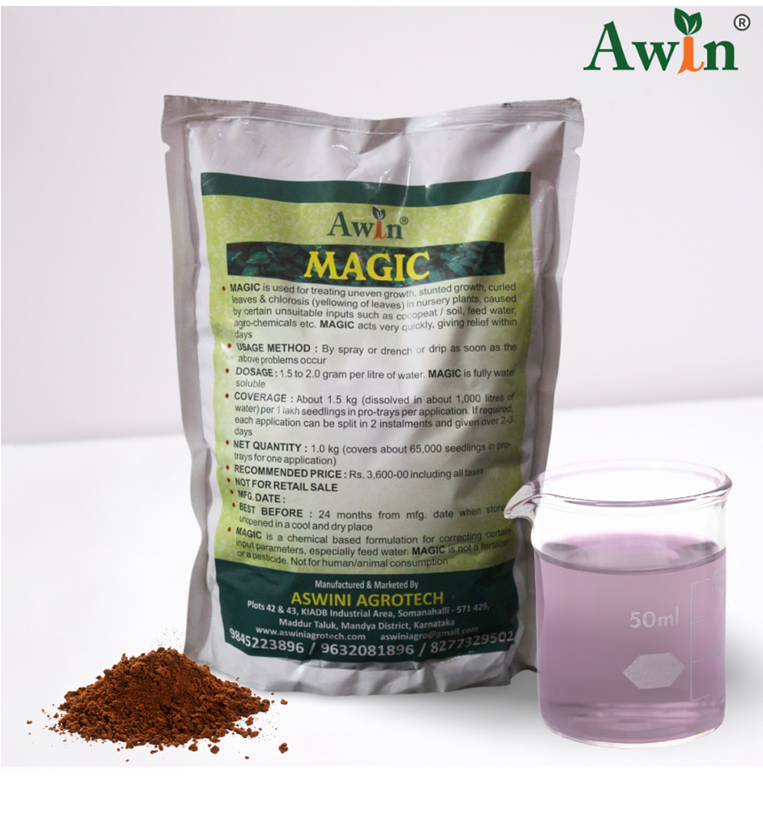 MAGIC is used to treat uneven growth, stunted growth, curled leaves & chlorosis (yellowing of leaves) in pro-tray seedlings / potted plants in nurseries caused by certain unsuitable inputs such as cocopeat, soil, feed water, agro-chemicals etc. MAGIC acts very quickly, giving relief within days.